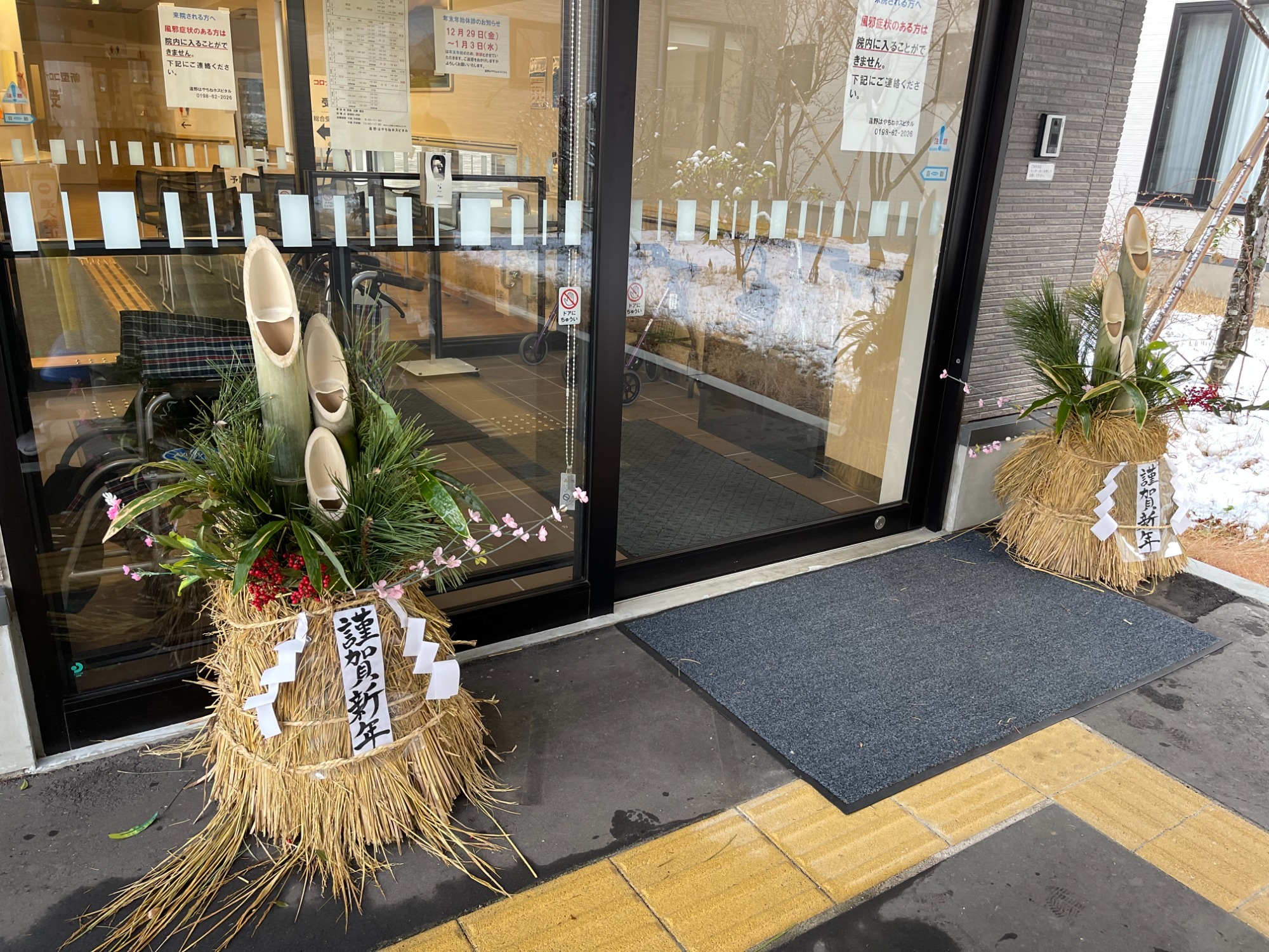 入口の門松はデイケアセンター朴の木の利用者と職員で共同し作成。